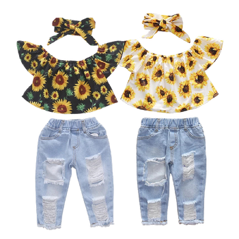 Conjunto de pantalones vaqueros rasgados con estampado de girasol y hombros descubiertos para niña, diadema, trajes para niños pequeños, ropa de verano, 3 uds., 2021